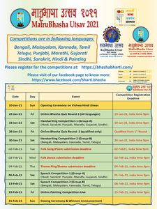 भारती भाषा संवर्धन संस्थान द्वारा आयोजित अंतरराष्ट्रीय मातृभाषा उत्सव में प्रत्येक वर्ष की तरह इस वर्ष भी हम अनेक भारतीय भाषाओं में प्रतियोगिताओं और कार्यक्रमों का आयोजन कर रहे हैं। 6 सप्ताह की अवधि के दौरान लोक गीत, लोक नृत्य, भाषण, कविता-पाठ, सुलेख, चित्र से कहानी एवं कविता लेखन, चित्रकला प्रतियोगिता और अनेक परिचर्चाएँ आयोजित की जाएगी। इस वर्ष 22 भारतीय भाषाओं में 150 से अधिक प्रतियोगिताएँ आयोजित की जा रही हैं, जिनमें किसी भी आयु वर्ग के सभी प्रतिभागी उचित वर्गानुसार अपनी पसंदीदा प्रतियोगिता में हिस्सा ले सकते हैं।